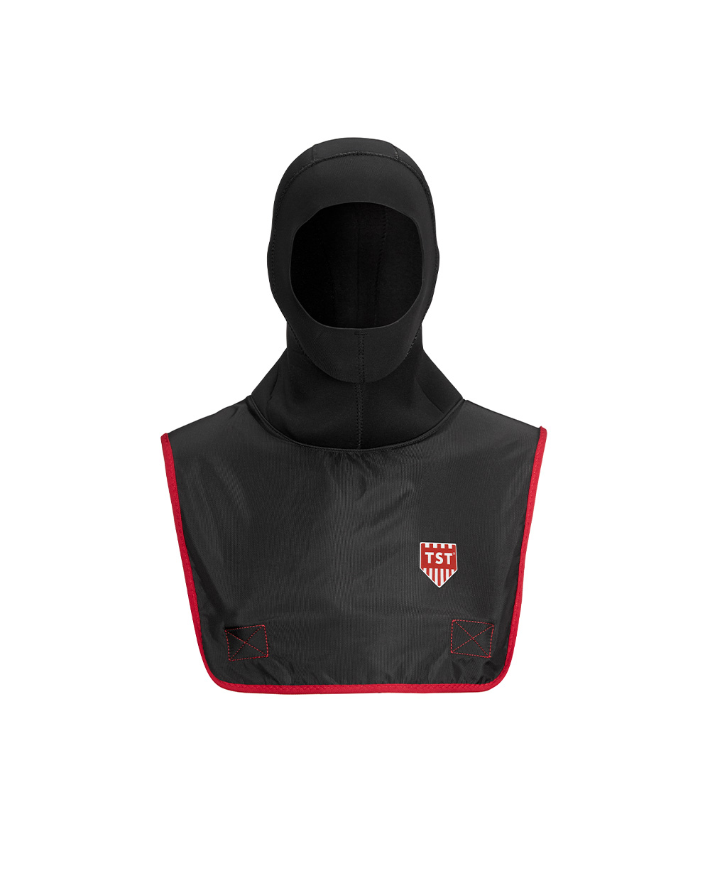 The balaclava, which is made of neoprene, is designed to keep the body dry. The breast lap is made of Cordura fitted with adjustable straps to hold it in place.The Balaclava offers no protection against water jets.