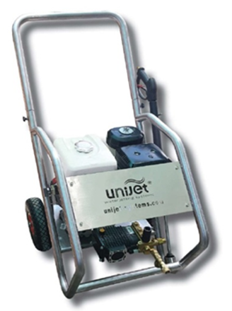 Waterjetting unit with sandblasting and hot water compatibility up to 200 bar, driven by a gasoline engine for the Shipping Industrial and Construction sector