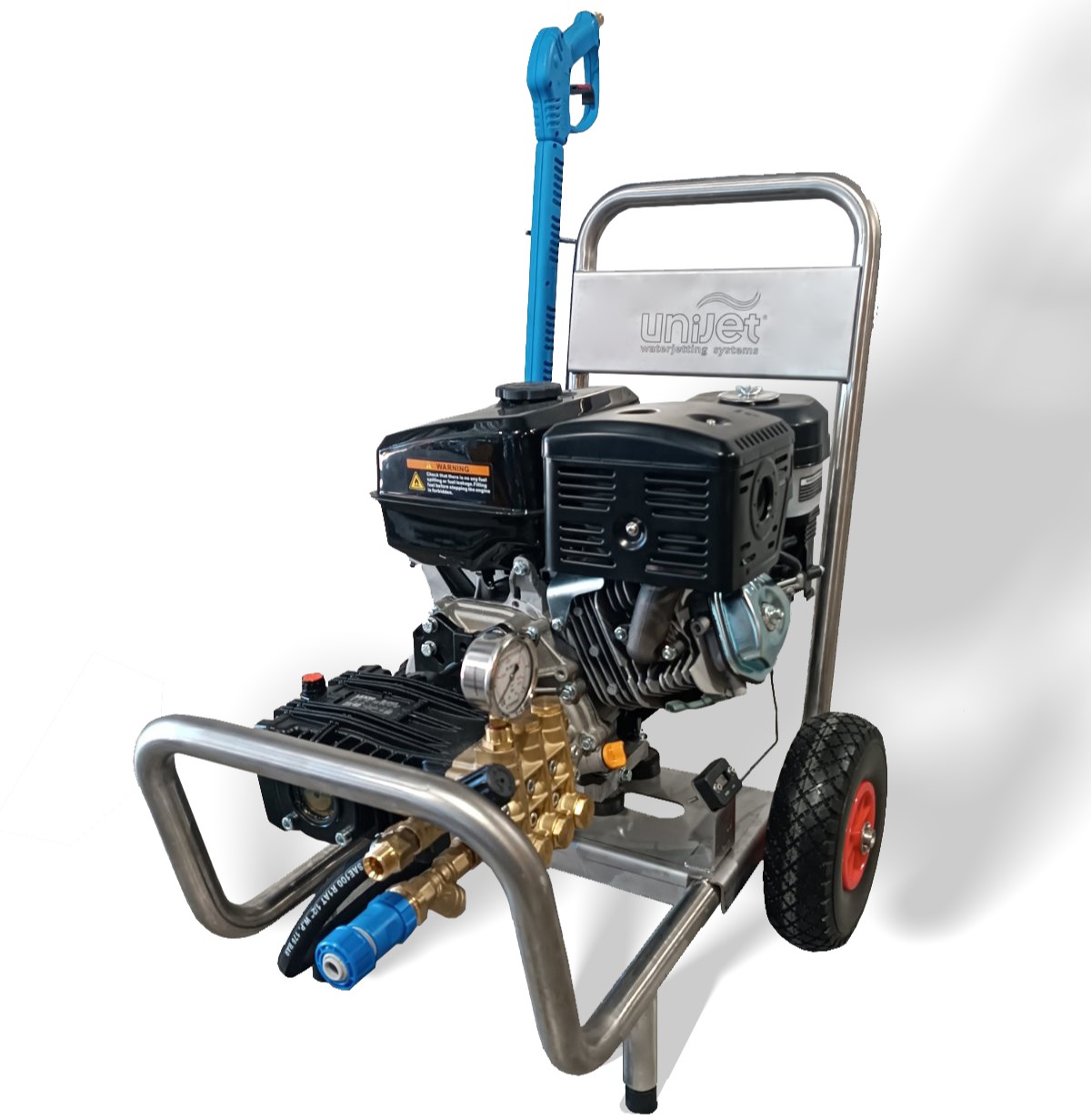 Waterjetting unit with sandblasting and hot water compatibility up to 300 bar, driven by a gasoline engine for the Shipping Industrial and Construction sector.