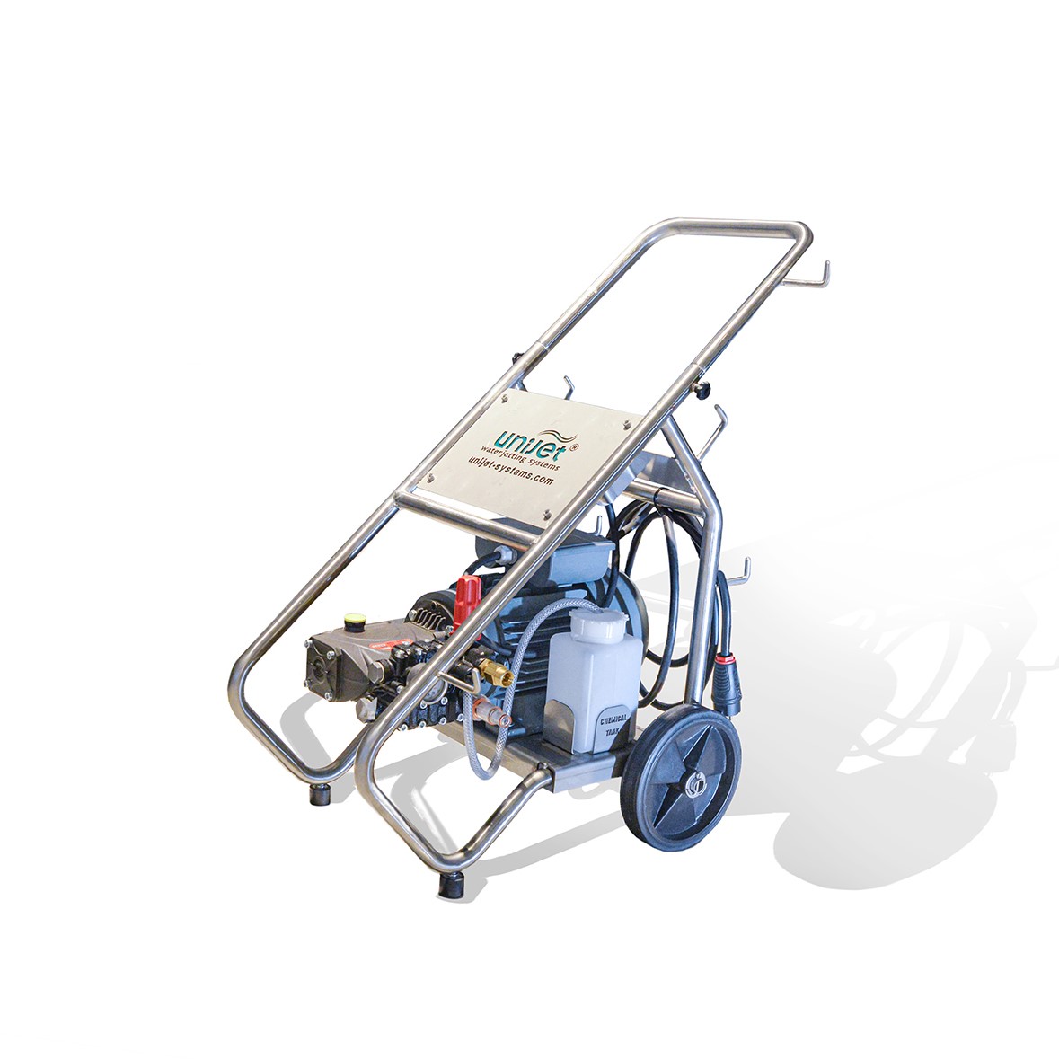 Waterjetting unit with sandblasting and hot water compatibility up to 160-180 bar, driven by an electric single-phase motor for the Shipping, Industrial and Construction sector.