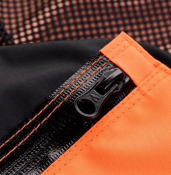 • Waterproof front zipper with overlapping flap.