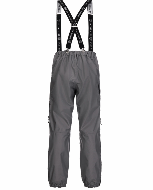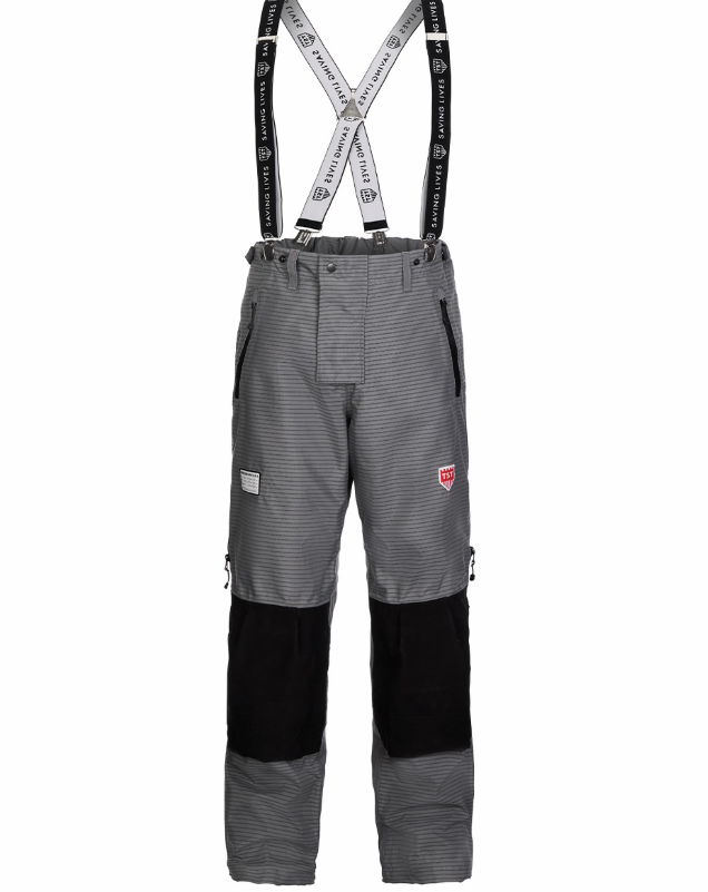 • Waterproof zippers at the bottom of the legs allow the trousers to widen to facilitate donning the boots. Waterproof zipper in fly with overlapping flap.