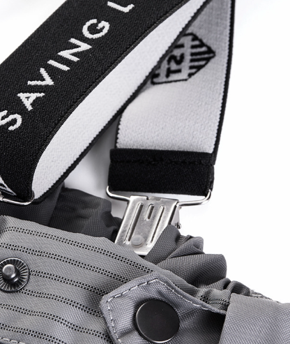 • Detachable elastic braces (included) and adjustable elastic waist for perfect fit. Loops for belt.